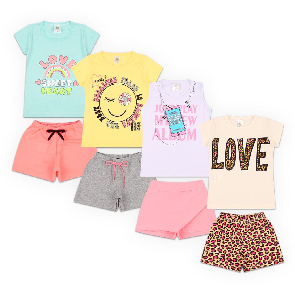 Kit com 5 Conjuntos SORTIDOS - Kit 10 Peças de Roupas Infantil Menina (5 Camisetas + 5 Shorts = 10 peças) *Recomendação de tamanhos* Tamanho 1 - Veste de 6 a 12 meses Tamanho 2 - Veste 1 ano Tamanho 3 - Veste 2 anos Tamanho 4 - Veste 3 anos Tamanho 6 - Veste 4/5 anos Tamanho 8 - Veste 6/7 anos Tamanho 10 - Veste 8/9 anos *VERIFICAR TABELA DE MEDIDAS* A camiseta é confeccionada em meia malha 100% algodão, gola redonda com reforço, possui manga curta e regata. Shorts é feito em algodão com poliéster, e saia algodão e poliéster, com elástico confortável na cintura. O conjunto é fabricado essencialmente com algodão em suas composições, garantindo resistência, maciez e conforto. É ideal para dias mais quentes, passeios e momentos de lazer, além de versátil e prático. Não perca essa oportunidade de lançamento na Polo Infantil Store e garanta seu Kit conjunto agora mesmo. Tamanhos de 6 meses a 10 anos de idade. Os tamanhos recomendados acima podem variar de acordo com o biotipo/tamanho de cada criança. * VERIFICAR TABELA DE MEDIDAS, BUSTO E CINTURA É MEÇO APENAS A FRENTE * ATENÇÃO ENVIAREMOS MODELOS VARIADOS CONFORME DISPONIBILIDADE EM ESTOQUE * NÃO TEM OPÇÃO DE ESCOLHA * TAMANHO DO CONJUNTO NÃO QUER DIZER A IDADE DA CRIANÇA *PARA ATÉ DOIS KIT DO MESMO TAMANHO, GARANTIMOS QUE NÃO VAI REPETIDO. PARA MAIS KITS ADQUIRIDOS DO MESMO TAMANHO PODE REPETIR COR OU ESTAMPA*