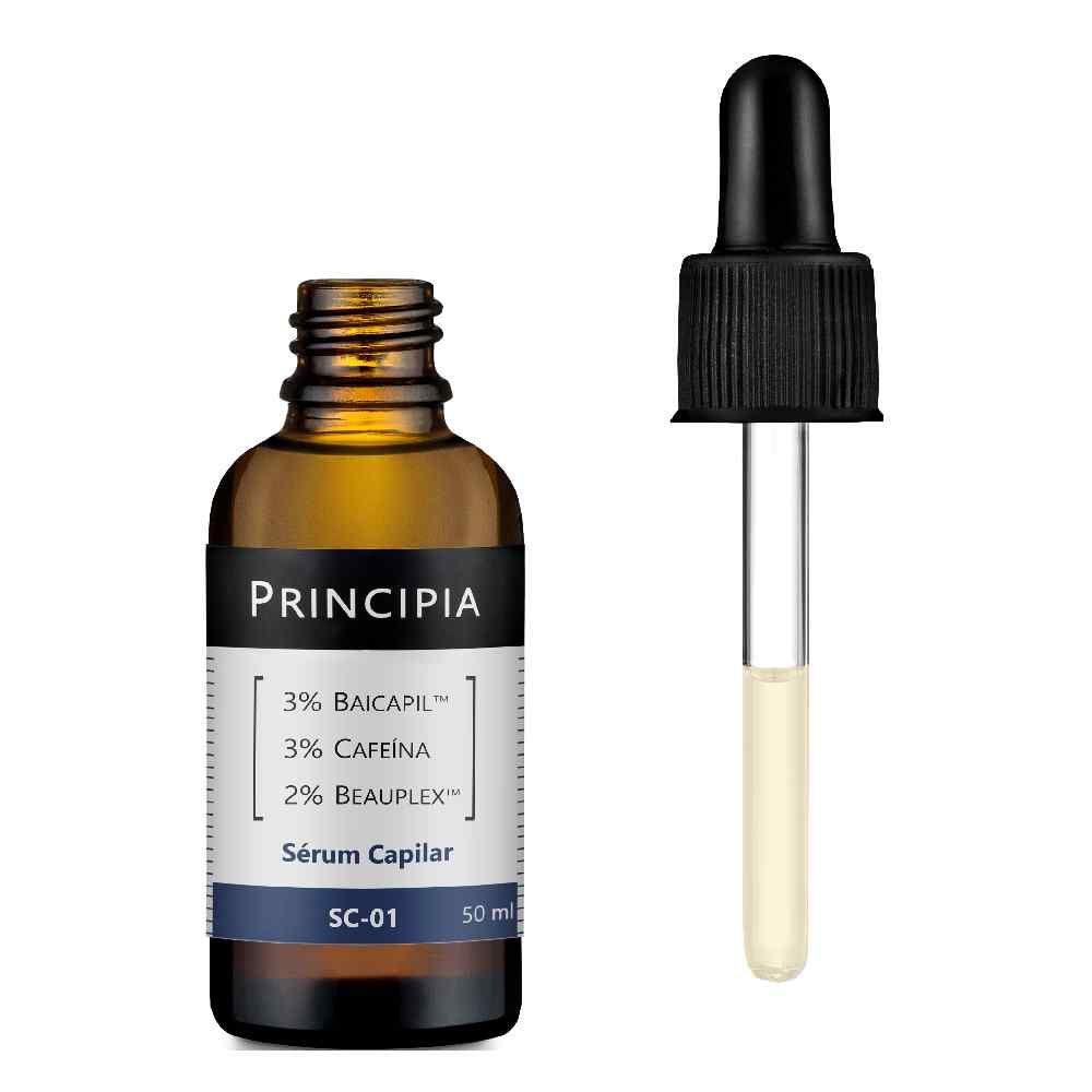 Sérum Capilar com 3% de Baicapil + 3% de Cafeína e 2% de Beauplex com alta eficácia na redução da queda e no crescimento do cabelo. INDICAÇÕES Principais » Reduzir a queda » Estimular o crescimento » Fortalecer os fios Complementares » Recuperar a pigmentação » Proporcionar volume Tipos de cabelo » Todos INGREDIENTES ATIVOS CAFEÍNA Um alcaloide metilxantina encontrado em diversas fontes de origem natural como grãos de café e folhas de chá. Com propriedades vasoconstritora, anti-inflamatória e antioxidante, tem alta eficácia contra olheiras e bolsas na área dos olhos, e na redução e clareamento de manchas na pele. Em formulações capilares, melhora a circulação sanguínea e inibe os efeitos do hormônio DHT, preservando os folículos e estimulando o crescimento do cabelo. BAICAPIL Associação de baicalina, composto com propriedades anti-inflamatórias utilizado na medicina tradicional chinesa, e outros ingredientes de origem botânica, que age nas células do folículo capilar, reduzindo a queda e estimulando o crescimento do cabelo. BEAUPLEX Composto com vitaminas B3, B5, B6, C e E, conhecido pelos benefícios para o couro cabeludo e pela eficácia na redução da queda, estimulo do crescimento, aumento da densidade e espessura do cabelo. MODO DE USO » Use diariamente, de preferência à noite Aplique a noite » Dispense algumas gotas no couro cabeludo, massageando suavemente » Evite lavar o cabelo após a aplicação » Evite contato com os olhos » Em caso de contato acidental com os olhos, enxague abundantemente » Não usar em crianças » Havendo irritação, suspenda o uso e procure por orientação médica » Conservar em temperatura ambiente, protegendo da luz DÚVIDAS FREQUENTES Contém parabenos, petrolatos e sulfatos? Não. Sua composição também não inclui silicones, fragrância, corantes nem glúten. Está regularizada na Anvisa? Sim, conforme o processo número 25351.452744-2022-71. Foi testada em animais? Não. A PRINCIPIA não realiza testes em animais. Qual o prazo de validade? Três anos, contados da data de fabricação. Pode ser usada junto com outras fórmulas? Sim, praticamente não há restrições para uso com outros ativos.